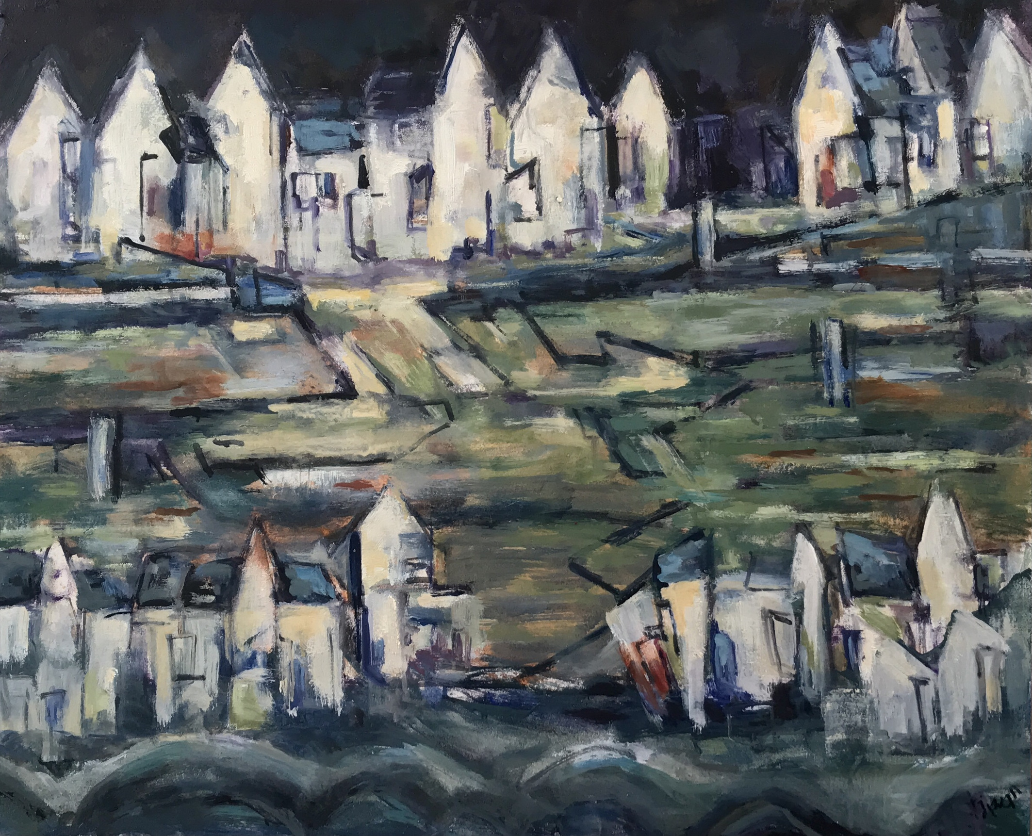 Inspired by the coastal towns of the UK, especially those on the Yorkshire and South coast of England. 61 x 51 cm on board.